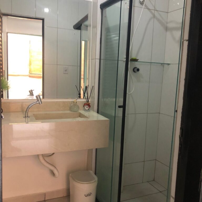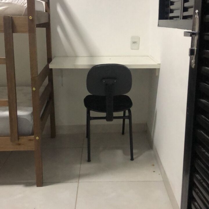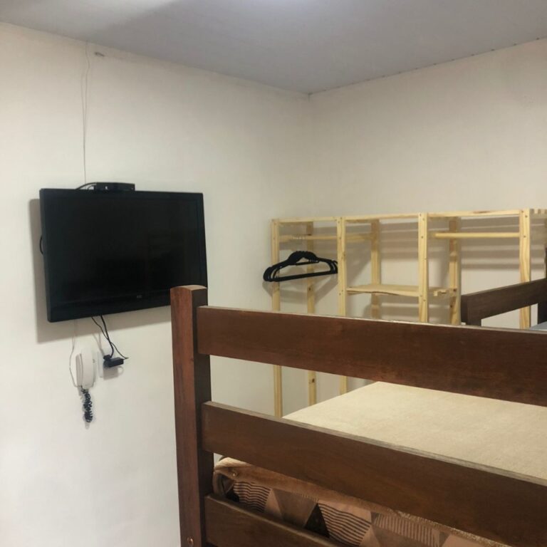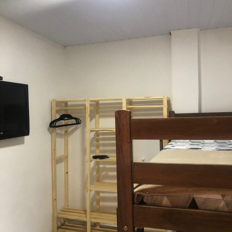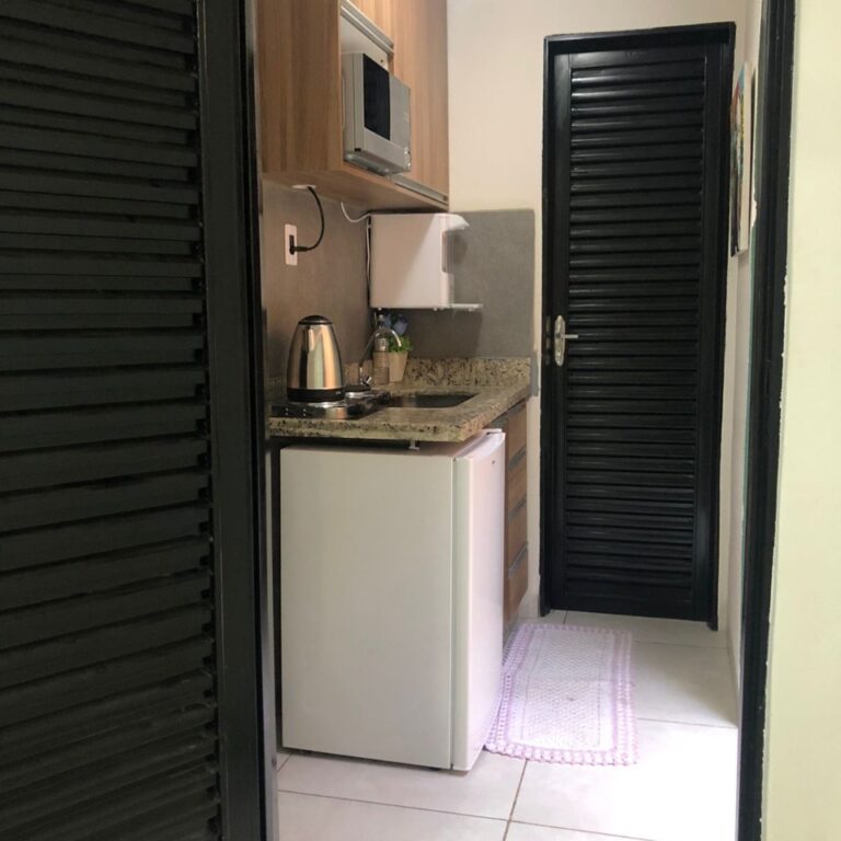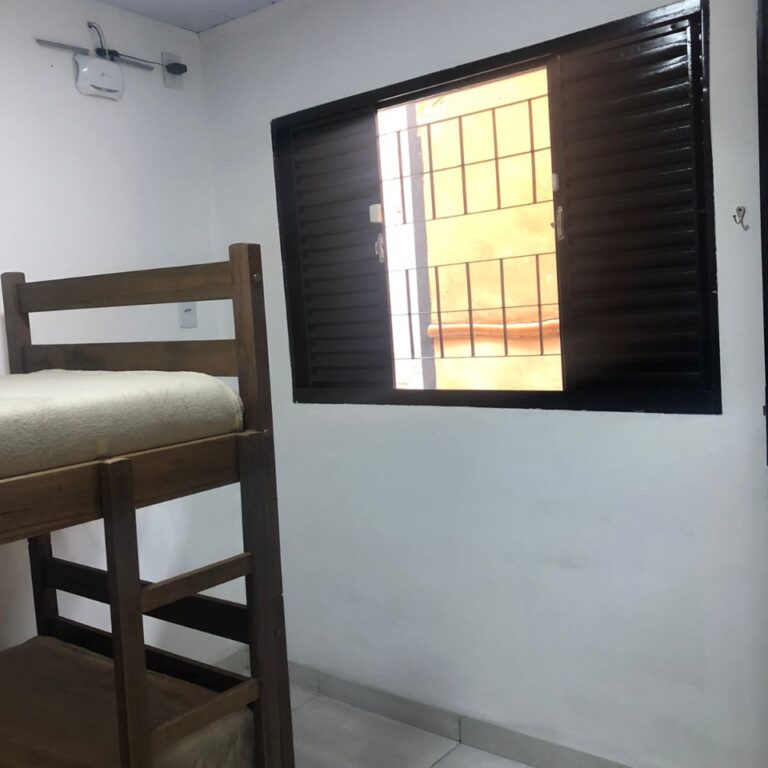 Cozinha equipada e banheiro completo, ambos compartilhados.