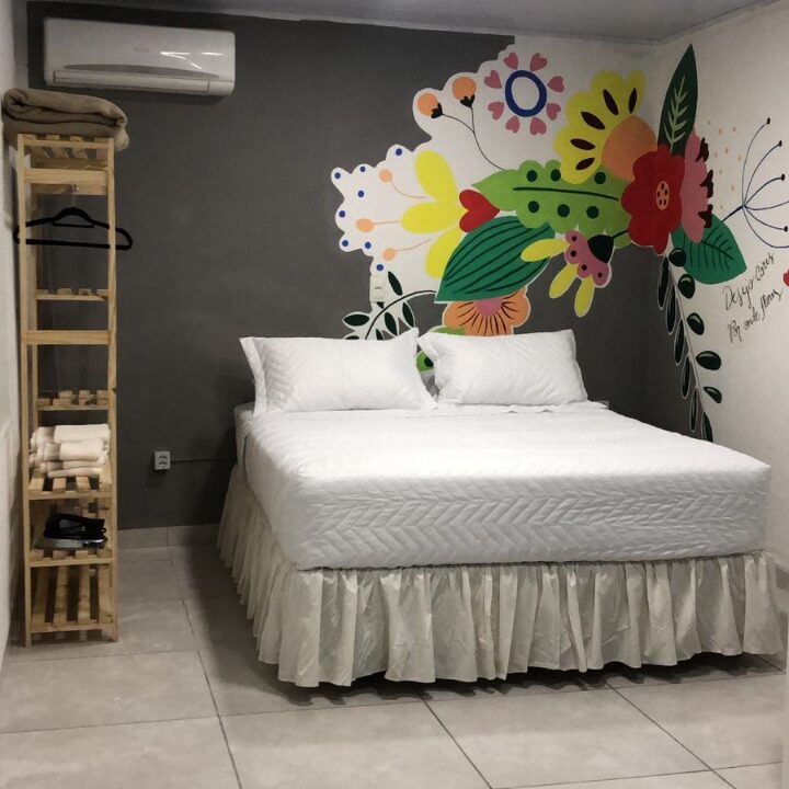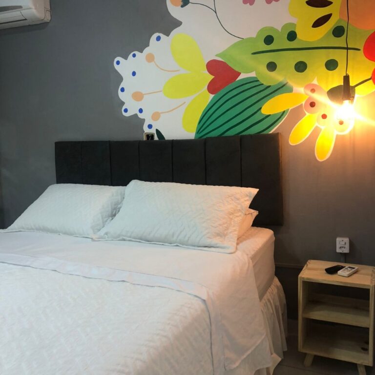 Quarto com ar-condicionado, cama queen, mesa para refeição, roupeiro, TV 42” com TV Box, acesso à internet de alta velocidade.
